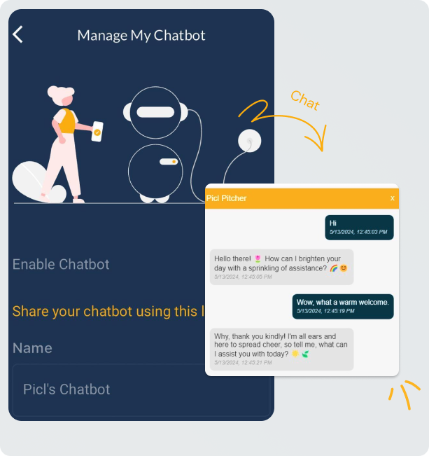 Immerse yourself in interactions with newfound connections through Picl Chat. Leverage your content and training inputs to mold your personalized Chatbot, infusing it with your unique traits. Seamlessly integrate it into your social media or websites, projecting your authentic self across your entire digital landscape.